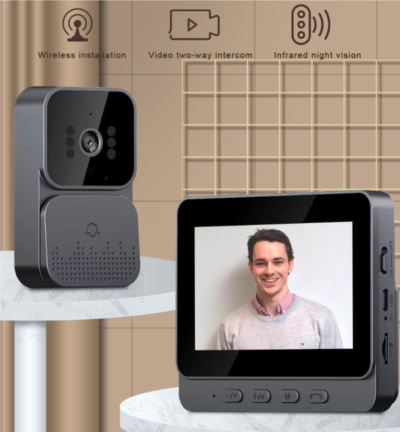 Video intercom:Camera doorbell, two-way video intercom, convenient and fast communication. Long transmission distance in open areas, stable signal, strong anti-interference. When the visitor rings the doorbell, the indoor unit is awakened and rings. Press and hold the relevant button to intercom, and release the button to hear the outdoor sound.